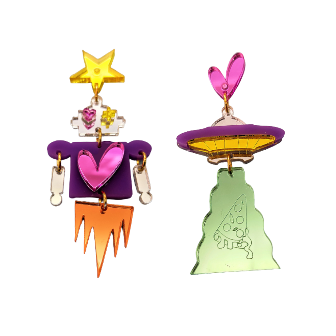 Pendientes en metacrilato con forma de ovni y un divertidísimo robot articulado . Elaborados en efecto espejo y son super ligeros.