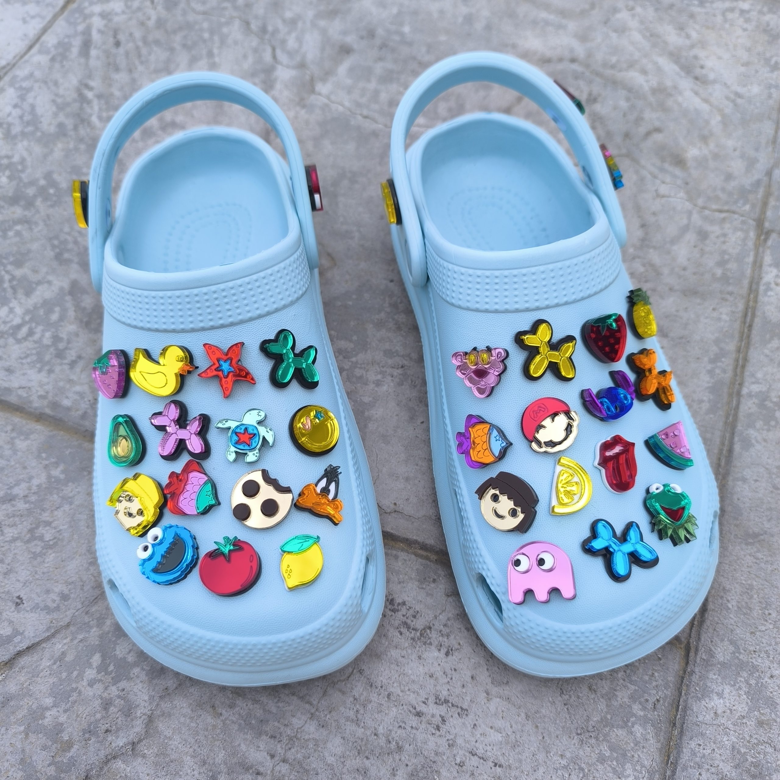 Cada pieza ha sido elaborada a mano, utilizando un grabado de precisión que define perfectamente las secciones de los “globos”, logrando un efecto tridimensional sorprendente. Es el complemento ideal para darle un aire creativo y original a tus zuecos, convirtiendo tu calzado en el centro de todas las miradas con un brillo que no pasa desapercibido.